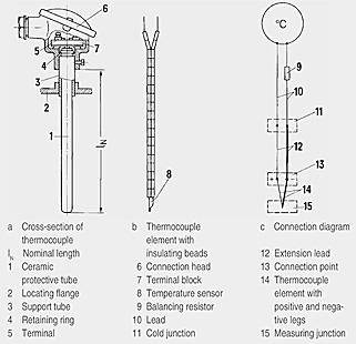 ФункцииПринцип измерения термопарыЕсли температура места измерения отличается от температуры на свободном конце сенсора, то между свободными концами возникает напряжение, термическое напряжение. Величина термического напряжения зависит от разницы между температурой места измерения и температурой на свободных концах, а также от вида комбинации материалов сенсора. Так как одним сенсором всегда регистрируется одна разница температур, то для определения температуры места измерения свободные концы должны находится в на клемме термокомпенсации с равномерной и известной температурой. Основные величины термических напряжений и допустимые отклоненияОсновные величины термических напряжений и допустимые отклонения для самых распространенных пар материалов приведены в DIN EN 60 584, часть 1 (см. „Технические параметры“, таблица „Основные величины термонапряжений и предельные отклонения“). Сенсоры Cu-CuNi и Fe-CuNi по DIN 43 710 предусмотрены в качестве запасных. Обычно поставляются сенсоры класса 2. Для более точных измерений могут поставляться сенсоры класса 1 с уменьшенным наполовину DIN-допуском или сертификатом заводского испытания. Допуски действуют только при поставке прибора. В процессе эксплуатации при высоких температурах допуски сенсоров могут изменяться из-за поглащения примесей, окисление или испарение составных частей сплавов. Принцип работыСенсоры от их места соединения через компенсационные линии по возможности имеют удлинение до места с равномерной температурой (клемма термокомпенсации). Компенсационные линии имеют туже идентификационную окраску как и соотвествующие сенсоры; плюсовой полюс окрашен в красный цвет. Следить за соблюдением полей при соединении, в ином случае возникают большие погрешности измерения. До 200 °C для компенсационных линий действуют те же основные величины и допуски что и для соотвествующих сенсоров. Влияние колебаний температуры на клемме термокомпенсации может быть устранено компенсационным подключением, например, с помощью компенсационной розетки. Эталонная температура составляет 0 °C (32 °F ) или 20 °C (68 °F). Клеммы термокомпенсации также могут сохранять постоянную температуру в 50, 60 или 70 °C (122, 140 или 158 °F) с помощью термостата (для нескольких мест измерения). От клеммы термокомпенсации к измерительному или процессуальному прибору прокладываются медные линии. У энергопотребляющих приборов, например, у индикаторов и точечных принтеров, весь измерительный контур (сенсор, компенсационная линия и медная линия) в рабочем состоянии должен компенсироваться уравнительным сопротивлением. Измерительный преобразователь SITRANS T и компенсационный самописец KOMPENSOGRAPH для подсоединения к термопарам имеют встроенную компенсационную схему для уравнивания влияния внешней температуры на клемму термокомпенсации. Благодаря высокому входному сопротивлению здесь отсутствует коррекция линейного сопротивления. Защитная арматура/защитные трубкиСенсор может быть защищен от механического или химического воздействия с помощью керамической или металлической защитной трубки, которая ввинчивается, приваривается или прифланцовывается к трубопроводам или резервуарам. Конец сенсора находится на соединительной головке. Примеры монтажа с предложениями для сенсоров и материалов защитных трубок см. в раз