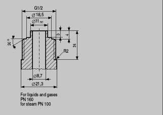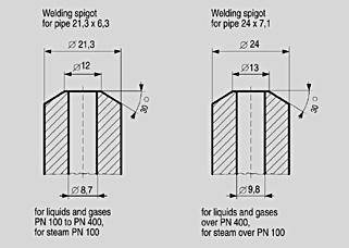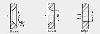 ФункцииПринцип работыДиафрагма создает динамический напор. Через вертикальный столб вещества в трубопроводах перепада давления он передается на измерительную ячейку измерительного преобразователя дифф. давления. Измерительный преобразователь преобразует сигнал давления с корневой характеристикой в пропорциональный расходу ток или цифровой сигнал, например, Profibus. Конструкции дроссельных приборовФормы отверстия дросселя Дроссельные приборы изготовляются по DIN EN ISO 5167. Поэтому сфера применения нормированного отверстия дросселя форма A ограничена числом Рейнольдса. Границы зависят от соотношения диаметра β = d/D. (D: внутренний диаметр трубы). Для чисел Рейнольдса в диапазоне от приблизительно 103 до 105 можно измерять с отверстием дросселя форма B (четверть круга) при несколько более высокой погрешности. Радиус профиля r зависит от соотношения диаметра β и получается из расчета диаметра отверстия дросселя d. Цилиндрическое отверстие дросселя форма D используется для измерения в обеих направлениях течения. Заборные штуцерыТип резьбовых и сварных соединений в зависимости от измеряемого вещества и ном. давления запорной арматуры Тип соединений штуцера зависит от измеряемого вещества и ном. давления запорной арматуры; длина штуцера зависит от диаметра (диаметр трубы) дроссельного прибора и рабочей температуры (из-за теплоизоляции!); положение штуцера зависит от измеряемого вещества и направления протока. Резьбовые соединения заборных штуцеров, размеры в мм Сварные соединения заборных штуцеров, размеры в мм Положение заборных штуцеров При измерении жидкостей и газов расположение заборных штуцеров может быть любым; при измерении пара уравновешивающие резервуара должны находится на той же высоте.