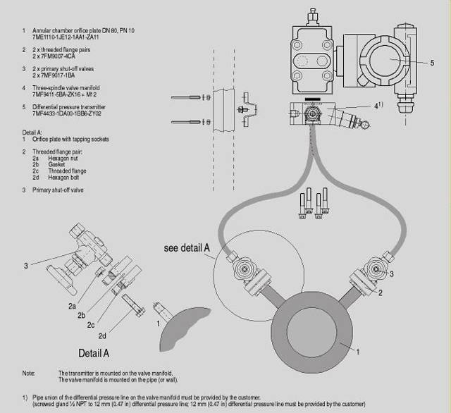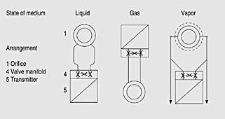 ИнтеграцияДиафрагма устанавливается между фланцами в трубопровод. Через уравновешивающие резервуары (для пара) и вентили первичной блокировки перепад давления плюсовой и минусовой стороны через трубопровод перепада давления направляется на универсальный вентильный блок и дальше на измерительный преобразователь дифф. давления. Для веществ с сильными перепадами давления и температуры имеет смысл дополнительное измерение давления и температуры для исправления сигнала расхода измерительного преобразователя в подключенном после корректоре. Выбор места монтажаПравила измерения расхода DIN EN ISO 5167 распространяются не только на конструкцию дроссельных устройств, но и предполагают стандартизированный монтаж для соблюдения указанных погрешностей. Уже на стадии проектирования трубопровода необходимо учитывать стандартизированный монтаж. Прежде всего необходимо обратить внимание на то, что монтаж дроссельного устройства должен осуществляться в достаточно длинный прямой участок трубы. Колена, вентили и т.п. должны быть установлены на таком расстоянии от дроссельного устройства, чтобы все помехи компенсировались до дроссельного устройства. Дроссельные устройства с большим соотношением диаметров особенно чувствительны к помехам! Конструкция мест измеренияКонструкция места измерения зависит от измеряемого вещества и параметров помещения на месте монтажа. Конструкция мест измерения, на примере измерения газа (не агрессивный, не опасное вещество) Измерительная схема | |||||||||||||||||||||||||||||||||||||||||||||||||||||||