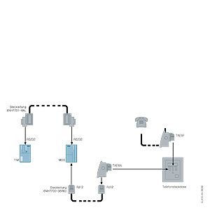 На приведенном ниже рисунке показан пример использования MD3 в режиме телефонного модема, поддерживающего функции автоматического вызова абонента. Модем подключается к модулю TIM через последовательный интерфейс RS 232. С помощью соединительного кабеля 6NH7 700-3BR60 (входит в комплект поставки) модем подключается к телефонной розетке TAE6. При использовании телефонной розетки TAE6F параллельно с модемом к той же телефонной розетке может быть подключен телефон.