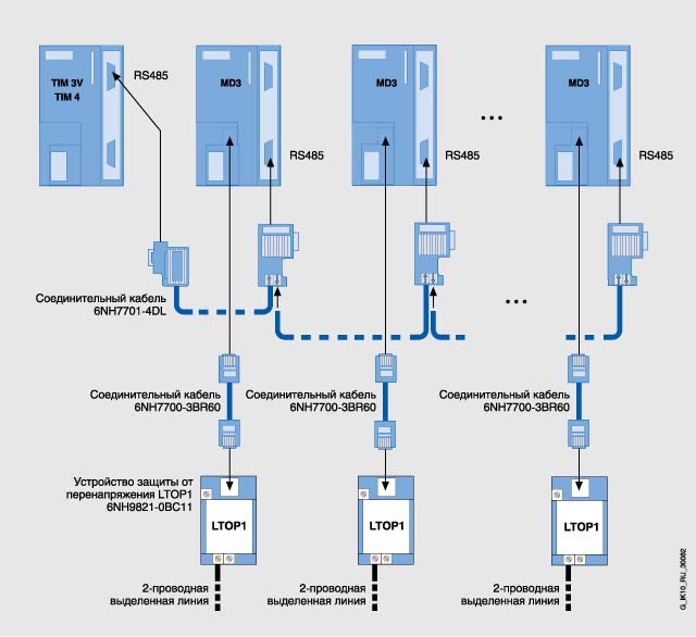 На приведенном ниже рисунке показан пример соединения сетевых компонентов при терминальном подключении 2-проводной выделенной линии связи. Соединительный кабель 6NH7 700-3BR60 входит в комплект поставки модема MD3.
