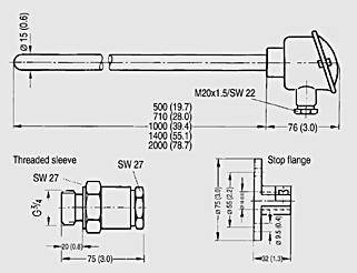 Чертеж Термометр сопротивления для дымового газа с соединительной головкой, размеры в мм (дюймах) |