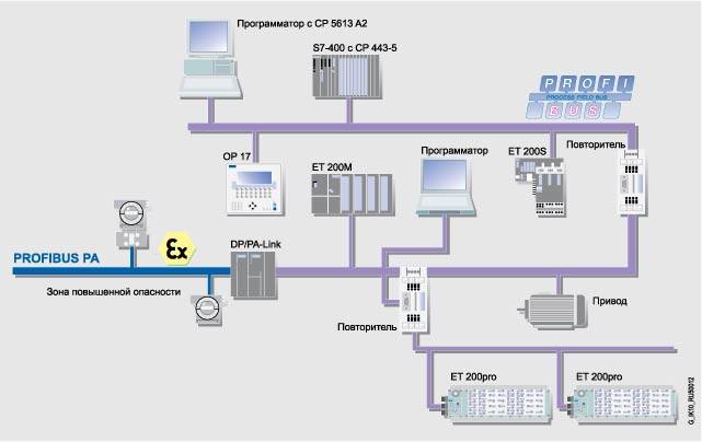 - В зонах повышенной опасности используется протокол PROFIBUS-PA, соответствующий требованиям международного стандарта IEC 61158-2. Скорость передачи данных равна 31.25 Кбит/с.