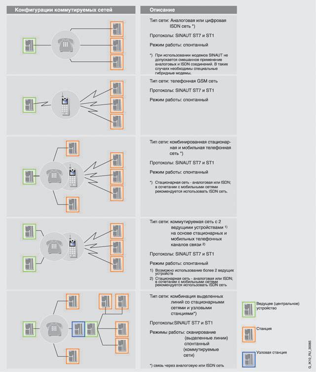 Обзор показывает сетевые конфигурации, возможные с SINAUT в WAN. Для каждой сетевой конфигурации показаны используемые SINAUT протоколы и режимы работы для коммуникаций по каждой сети. Симовлы описыват функциональность портов WAN на модуле TIM. Модуль TIM 3 имеет один WAN порт, TIM 4 - два WAN порта. Два порта на TIM 4 могут выполнять одинаковые (например, 2 x мастер) или разные (например, узел + мастер) функции. При резервированных WAN соединениях всегда необходимо использовать TIM 4 с двумя портами, т.к. резервированное соединение всегда начинается/заканчивается на модуле TIM.