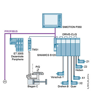 Электрические приводы реализуются как SINAMICS S120 и двигатели 1FK7, которые обеспечивают высоко-динамичное и воспроизводимое позиционирование. В случае гидравлических гибочных осей клапаны могут управляться от терминальногомодуля TM31 с аналоговыми входами и выходами. Для контроля положения имеются датчики с такт-синхронным интерфейсом Profibus.
