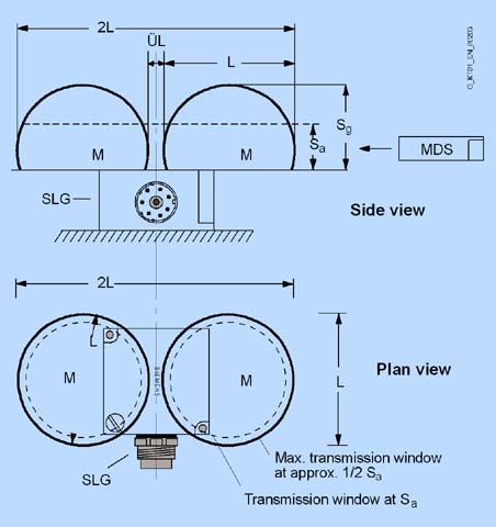 Предпосылкой для функционирования MDS является минимальная напряженность поля у MDS, которая достигается на расстоянии Sg от устройства записи/чтения. На следующем чертеже показано окно передачи между мобильным накопителем данных и устройством записи/чтения.