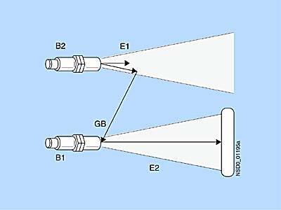Два датчика Simatic PXS смонтированы на расстоянии е, которое меньше минимального (см. инструкции по монтажу). Объект находится в их общей коммутационной зоне. Эхо от B2 может путем отражения попасть на B1 (GB). Поэтому может иметь место взаимное влияние. Объект захватывается обоими эхо E1 и E2 от датчиков Simatic PXS B1 и B2. Благодаря синхронизации можно добиться, чтобы оба прибора перестали влиять друг на друга, так, например, эхо E1 приходит на BERO B2 только после E2. Приборы всегда реагируют только на первое эхо.