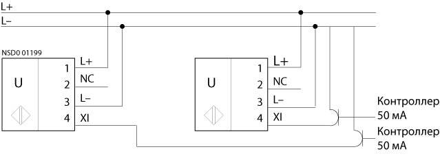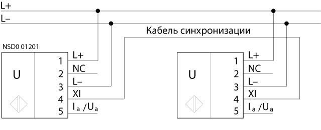 Несколько датчиков компактных типорядов II, III и М18 могут быть синхронизированы друг с другом путем соединения только их выходов синхронизации (контакт 2 при функции замыкающего контакта, контакт 4 при функции размыкающего контакта). Можно синхронизировать до 10 приборов (до 6 приборов компактной модели 0). Благодаря этому во многих случаях становится возможной установка датчиков очень близко друг к другу без их взаимного влияния.