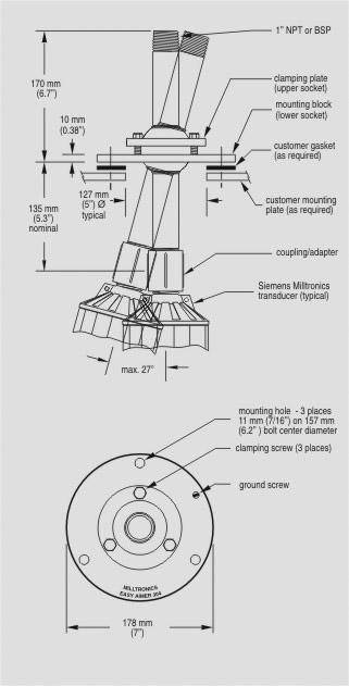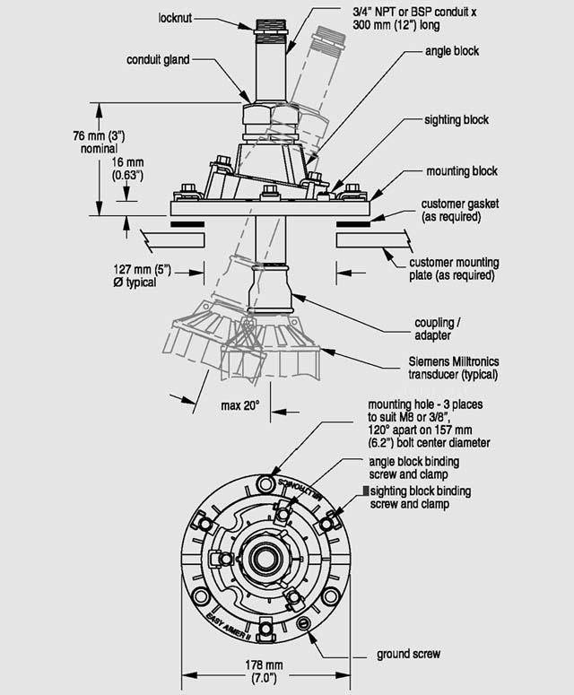 Область примененияПереставной фланец тип EA 304Переставной фланец тип EA 304 из нержавеющей стали позволяет осуществлять точную установку используемых для измерения сыпучих веществ ультразвуковых сенсоров от Siemens Milltronics. Сенсор монтируется выровненным по точке забора в силосе. Поворотный блок поворачивается на 360°, при этом наклон сенсора может составлять от 0 до 27° от вертикали. Монтаж осуществляется через монтажную плату с приваренными резьбовыми болтами или фланец с тем, чтобы изолировать монтажные отверстия от находящегося под давлением окружения. При правильной установке переставной фланец типа EA 304 выдерживает давление до 0,5 bar (Европа) или 15 psi (Северная Америка). Он может использоваться в корродирующем и агрессивном окружении. Переставной фланец тип EA - 2Переставной фланец тип EA-2 из алюминиевого литья позволяет осуществлять точную установку ультразвуковых сенсоров от Siemens Milltronics. Переставной фланец имеет опорную маркировку и настраиваемую глубину погружения. При использовании с сыпучими веществами сенсор выравнивается по точке забора в силосе. Поворотный блок поворачивается на 360°, при этом наклон сенсора можетсоставлять от 0 до 20° от вертикали. Монтаж осуществляется через монтажную плату с приваренными резьбовыми болтами или фланец с тем, чтобы изолировать монтажные отверстия от находящегося под давлением окружения. При правильной установке переставной фланец типа EA-2 выдерживает давление до 0,5 bar (Европа) или 15 psi (Северная Америка). Он может использоваться в корродирующем и агрессивном окружении.
