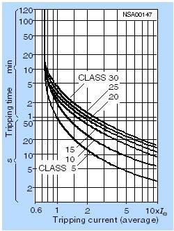 Время-токовая кривая для 3-полюсной симметричной нагрузки показывает зависимость между временем срабатывания из холодного состояния и кратным значением рабочего тока.