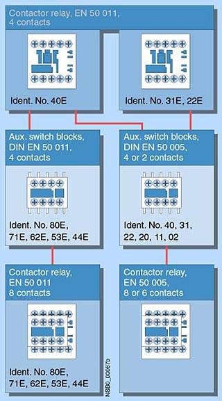 Все вспомогательные контакторы  с  4 контактами  в  соответствии с EN 50011, идентификационные номера  от 40E до 22E, могут быть расширены блоками вспомогательных контактов от 40 до 02, чтобы получить вспомогательный контактор с  6 или 8 контактами в соответствии EN 50005. Идентификационные номера на блоках вспомогательных контактов относятся только к установленным блокам вспомогательных контактов.