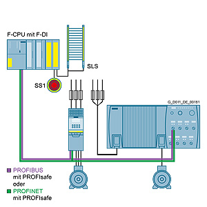 Функции SS1 и SLS могут использоваться, если нагрузка никогда не ускоряется при отключении преобразователя частоты. Тем не менее функции не применимы к тяговым приводам, таким как подьёмники или намотчики.