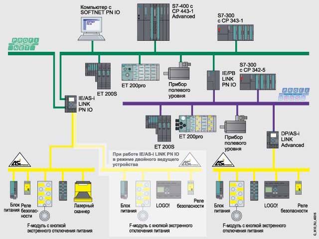 В программируемых контроллерах SIMATIC S7-200, S7-300, S7-400, SINUMERIK и SIMOTION C межсетевой обмен данными происходит через встроенные интерфейсы и/или через коммуникационные процессоры. Управление межсетевым обменом данными осуществляет центральный процессор контроллера. Сетевые переходы PROFINET с функциями proxy Сегменты сети PROFIBUS могут подключаться к Industrial Ethernet через PROFINET proxy. Такие соединения выполняются через системы компьютерного управления SIMATIC WinAC PN, центральные процессоры программируемых контроллеров SIMATIC S7-300/400 с встроенными интерфейсами DP и PN, модули связи IE/PB Link или IE/PB Link PN IO. Для подключения к беспроводным сетям могут использоваться точки доступа семейства SCALANCE W-700 и модули связи IWLAN/PB Link PN IO. Это позволяет выполнять доступ к данным всех стандартных ведомых устройств PROFIBUS со стороны контроллеров ввода-вывода сети PROFINET. PROFINET Базируясь на Industrial Ethernet, PROFINET обеспечивает поддержку непосредственного обмена данными между приборами ввода-вывода полевого уровня и контроллерами ввода-вывода, а также изохронного режима в распределенных системах управления перемещением. Кроме того, PROFINET позволяет создавать модульные системы управления с распределенным интеллектом (Component Based Automation). Типы приборов PROFIBUS DP Все приборы сети PROFIBUS DP можно разделить на три группы: Ведущее DP устройство класса 1 Ведущие DP устройства класса 1 являются основными компонентами сети PROFIBUS DP. В этом режиме программируемый контроллер или компьютер управляет циклическим обменом данными с ведомыми DP устройствами. Ведущее DP устройство класса 2 Приборы этого типа (программаторы, приборы контроля) используются для выполнения пуско-наладочных работ, конфигурирования DP системы и контроля (диагностики) за работой системы. Например, они позволяют считывать значения входных и выходных сигналов, диагностическую информацию и параметры настройки ведомых DP устройств. Ведомые DP устройства Ведомые DP устройства - это станции ввода-вывода, поддерживающие обмен данными с ведущими DP устройствами. Объем входных и выходных данных на телеграмму зависит от типа прибора и может достигать 244 байт. Ведущее устройство AS-Interface AS-Interface - это сеть с одним ведущим устройством, блоками питания и ведомыми устройствами. Управление обменом данными с ведомыми устройствами выполняет ведущее сетевое устройство. |