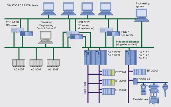 Мультиклиент и двухканальнаая фунциональностьДанные от разных частей системы могут отображаться на одном экране процесса на OS клиентах, как из контроллеров Freelance AC 800F через Ethernet, так и из контроллеров SIMATIC PCS 7 через Industrial Ethernet. Это возможно благодаря архитектуре мультиклиента (multi-client), когда клиент может запрашивать данные с разных серверов. При малых конфигурациях также возможно использовать функции двойного канала PCS 7/F2K OS Server. В этом случае, сервер осуществляет коммуникации с двумя системами через двухканальную DLL. |