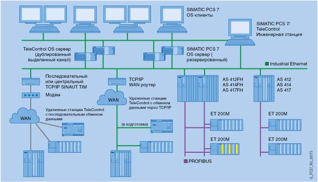 PCS 7 с PCS 7 TeleControl; является идеальным решением для центров управления предприятий, на которых большое количество локальных задач автоматизации должно дополняться соединениями с удаленными подстанциями. Кроме протокола SINAUT ST7 для обмена данными с удаленными подстанциями могут использоваться протоколы DNP3 или IEC 870-5-101/-104.