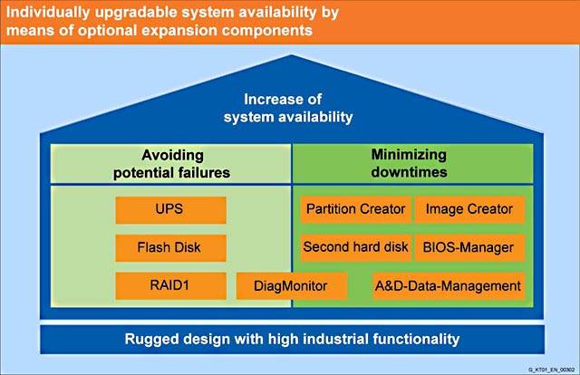 ОсобенностиВозросшие возможности благодаря диагностике и функциям сообщений:SIMATIC PC DiagMonitor: Программное обеспечение SIMATIC PC DiagMonitor отличает разумная диагностика, функции сообщений и записи событий для систем клиент/сервер. Возможные аппаратные и температурные проблемы определяются на ранней стадии; система сообщений (например определение выхода из строя вентиляторов и жестких дисков) посылает по Ethernet, e-mail или SMS или через интерфейс OPC в программное обеспечение SIMATIC. В системе клиент/сервер это программное обеспечение поддерживает быструю регистрацию выхода из строя компонент сети. Это увеличивает надежность системы и уменьшает стоимость вызванную остановками оборудования. Большая системная работоспособность благодаря дополнительным аппаратным и программным опциям:Второй жесткий диск: Использование второго жесткого диска поддерживает быстрое и легкое резервное копирование целых приложений (с SIMATIC PC Image Creator). В случае потери данных, все приложение может быть быстро востановлено. Это очень сохраняет время и деньги. Конфигурация RAID1 (зеркальные диски) RAID1 увеличивает надежность PC автоматически сохраняя данные на втором жестком диске. Приложение будет продолжать работать даже при выходе из строя одного из жестких дисков. Немедленный сервис с выключениим PC не понадобится. Системы с Flash disk: В случае более высоких требований по температуре, вибрации и удару, для более надежного сохранения данных рекомендуется устройство сохранения данных без движущихся частей. С этими требованиями стандартные жесткие диски меньше применимы и решение на flash диск предпочтительны. "Flash disk" это электронное устройство сохранения данных. Системы с flash диском требует специальной операционной системы и специальную разработку приложения смотри пользовательскиеSIMATIC PC. Бесперебойные источники питания (UPS): Электрическое оборудование и современные операционные системы реагируют на сбои энергии, такие как скачки напряжения и частоты, короткие прерывания подачи питания. В этом случае в процессе сохранения данных, они могут быть потеряны. Бесперебойный источник питания (UPS) необходим как источник напряжения на определенное время (например для остановки системы) при прекращении подачи основного питания. Источники бесперебойного питания SITOP и Masterguard обеспечивают подачу питания DC 24 V или AC 120/230 V для таких целей. Максимальная надежность системы обеспечивается с помощью использования дополнительного сохранения данных и программ:Предлагаемые программные пакеты - это идеальный инструмент для профилактического копирования данных для предотвращения их потери. Эти пакеты используются для сохранения и быстрого востановления целых программных пакетов с соответсвующими данными. Этим предотвращается длительная остановка PC и переинсталляция операционной системы и программных пакетов - это сохраняет время и деньги. Для каждого типа приложений, будь то один PC, простая или сложная сеть, эти инструменты доступны: SIMATIC PC/PG Image Creator: SIMATIC PC/PG Image Creator - это программное обеспечение для легкого сохранения и быстрого востановления содержания всего жесткого диска (образа диска). SIMATIC PC/PG Image & Partition Creator: Программное обеспечение как для легкого сохранения и быстрого востановления содержания всего жесткого диска (образа диска), так и для изменения разделов диска. SIMATIC A&D D