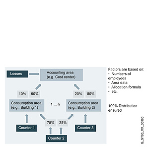 Вычисление и назначение/распределение энергетических затрат по МВЗ (местам возникновения затрат) и/или заказчикам/ элементам затрат в соответствии с принципом затрата-причина. Поддерживаются восходящие (измерение) и нисходящие (назначения) процедуры.