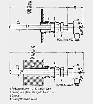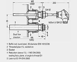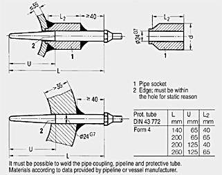 ИнтеграцияЗащитные трубки в трубопроводеТермометр сопротивления для дымового газаСмонтирован в канал из стальных листов(вверху) или канал дымового газа (внизу) Вкручивающийся термометр сопротивленияВ линии угольной пыли, с отбойником Вкручивающиеся защитные трубки, смонтированныеСверху для пониженного давления, с винтовой цапфой G½; снизу для высокого давления, с винтовой цапфой G1 Должна быть возможность для сваривания штуцеров и трубопровода. Материал по данным изготовителя трубопровода или резервуара. Приварные защитные трубки, смонтированныеСверху: толщина стенкиWall thickness ≤ 35 мм; монтаж с приварным штуцером; снизу: толщина стенки > 35 мм |