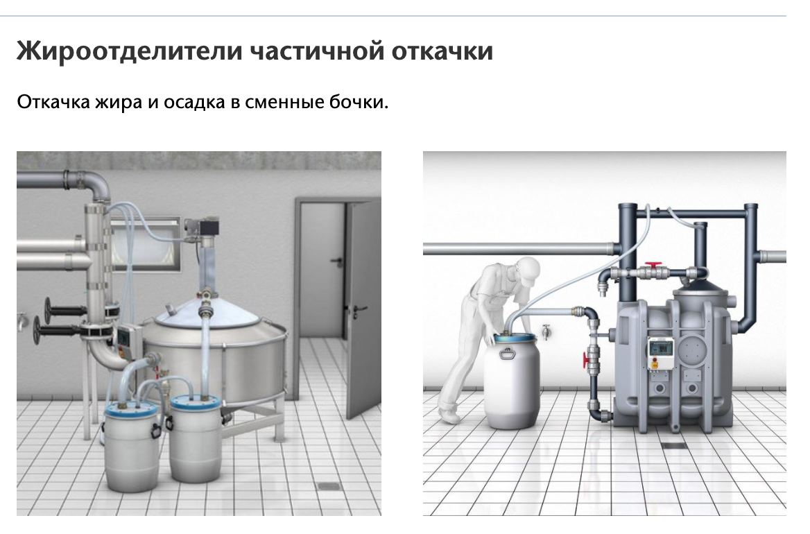 В жироотделителях с частичной откачкой, жир и осадок откачиваются в 2 сменные бочки, которые легко заменяются при наполнении. При накоплении достаточного числа заполненных бочек (на усмотрение эксплуатирующей компании), вызывается утилизирующая компания для вывоза емкостей. Для использования такого жироотделителя в здании, необходимо предусмотреть возможность выноса бочек по техническим коридорам, лестницам или, если применимо, подъема на лифте для технического персонала. Во время откачки жира и осадка в бочки, а также их смене, не требуется прекращение работы кухни предприятия.